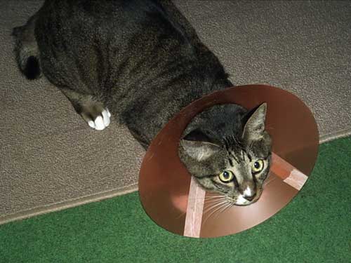 カラーが邪魔なのか後ろ方向にしか歩きません。ご飯も食べてくれません。。。仲良しのチャムとも耳を舐められてしまうため、隔離。。。